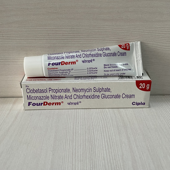 Fourderm Cream contains four active ingredients: Chlorhexidine – An antiseptic that kills germs and prevents infection. Clobetasol – A potent corticosteroid that reduces redness, itching, and swelling by suppressing inflammatory chemicals in the skin. Miconazole – An antifungal agent that damages fungal cell membranes and kills fungi. Neomycin – An antibiotic that stops bacterial growth by inhibiting protein synthesis. Together, they provide broad-spectrum action against infection and inflammation.