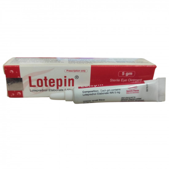 Lotepin Eye Ointment 5 gm is a prescription ophthalmic (eye) medication that contains loteprednol etabonate, a type of corticosteroid used to reduce inflammation, swelling, redness, itching, and discomfort in the eyes. It is supplied as a 5 gram ointment tube for topical application to the eye.