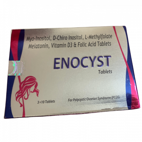 Tab Enocyst is a nutraceutical supplement formulated to support women with Polycystic Ovary Syndrome (PCOS) and related hormonal and metabolic disorders. It contains a scientifically balanced combination of inositols, melatonin, folate, and vitamin D₃, which work together to improve ovarian function, regulate menstrual cycles, and enhance fertility outcomes.