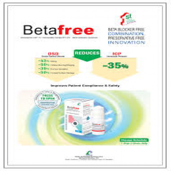 Betafree Eye Drop is a prescription ophthalmic medication used in the management of glaucoma and ocular hypertension. It contains a combination of medicines that help lower elevated pressure inside the eye by reducing the production of aqueous humour (the fluid within the eye). Controlling eye pressure helps prevent optic nerve damage and vision loss.