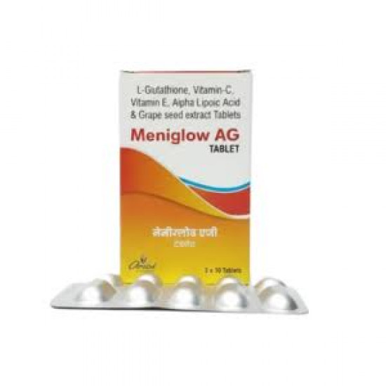 Meniglow Ag (L-GLUTATHIONE-500MG, VITAMIN-C 50MG, VITAMIN E 50IU, ALPHALIPOIC ACID 50MG, GRACE SEED EXTRACT 50MG) is your daily defense against environmental damage, helping you achieve a youthful, glowing complexion. For best results, take one Meniglow Ag Tablet daily with a meal, or as directed by your healthcare professional. Do not exceed the recommended dose.