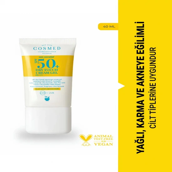 The COSMED Dry Touch Cream Gel is a lightweight moisturizer that provides a matte finish, making it ideal for oily or combination skin types. Apply a small amount to clean, dry skin in the morning or as needed throughout the day, focusing on areas prone to shine. It can also be used as a base before makeup application for a smooth, matte effect.
