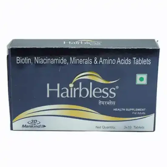Hairbless tablet is a nutritional supplement containing amino acids, multi-minerals, biotin, and niacinamide that promotes hair growth. It is used to reduce hair loss, add volume and shine to the hair. It improves hair growth by increasing blood flow to the roots. Also, it prevents greying of hair and improves blood circulation.