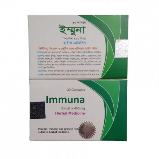 Immuna capsule is formulated with Spirulina and eight essential amino acids. Spirulina contains 65%-71% protein, Vitamin A (10 times more than the amount of carrots), and some minerals.
